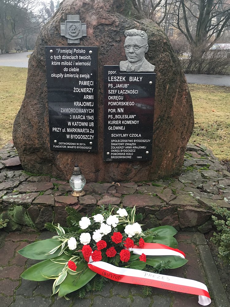 Uroczystość uświetnił recital fortepianowy Tomasza Gumiela (pianista solowy i kameralista, absolwent i wykładowca Akademii Muzycznej w Bydgoszczy). Wykonał utwory Ignacego Jana Paderewskiego i Fryderyka Chopina (ok. 20 min). Po zakończonej ceremonii Prezes Instytutu, w towarzystwie dyrektora oddziału gdańskiego prof. Mirosława Golona i przedstawiciela odznaczonych prof. Wojciecha Polaka (UMK Toruń, Europejskie Centrum Solidarności), złożył kwiaty pod pomnikiem upamiętniającym postać Leszka Białego „Jakuba”, szefa łączności Okręgu Pomorskiego AK, zamordowanego przez komunistyczną bezpiekę w marcu 1945 r. |