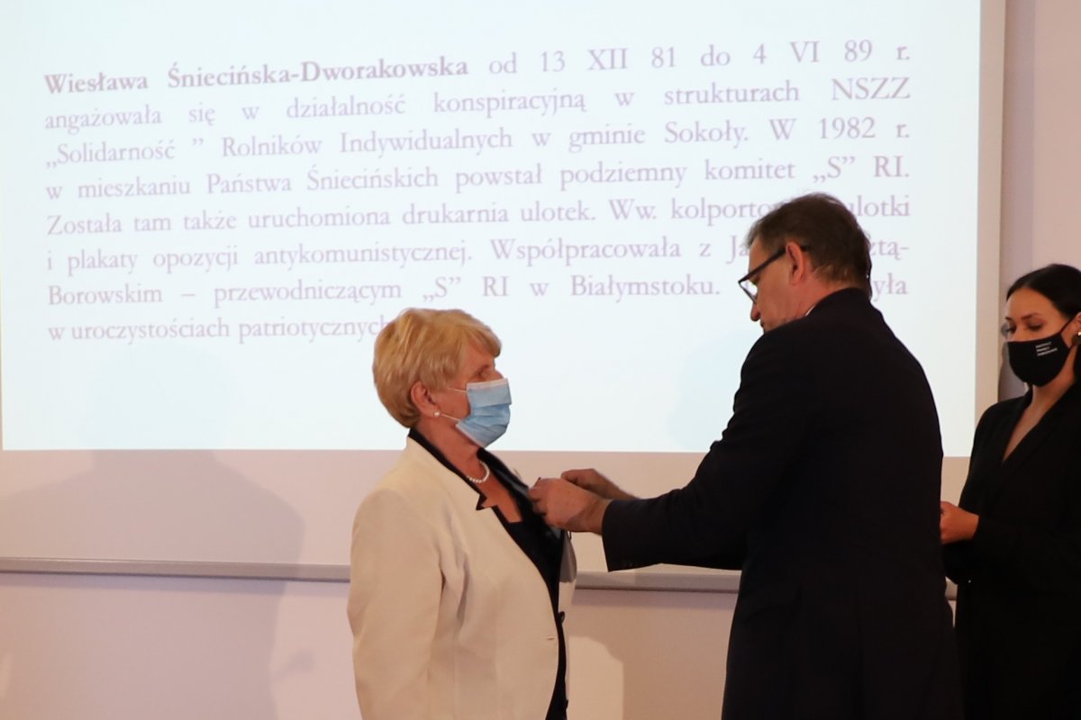 Wiesława Śniecińska-Dworakowska od 13 XII 81 do 4 VI 89 r. angażowała się w działalność konspiracyjną w strukturach NSZZ ,,Solidarność ” Rolników Indywidualnych w gminie Sokoły. W 1982 r. w mieszkaniu Państwa Śniecińskich powstał podziemny komitet ,,S” RI. Została tam także uruchomiona drukarnia ulotek. Ww. kolportowała ulotki i plakaty opozycji antykomunistycznej. Współpracowała z Janem Besztą-Borowskim – przewodniczącym „S” RI w Białymstoku. Uczestniczyła w uroczystościach patriotycznych.