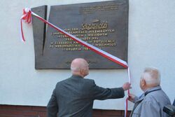 Inicjatorem odsłonięcia tablicy był wicemarszałek Senatu Jan Wyrowiński (był także internowany w Potulicach i Strzebielinku). Wykonał ją rzeźbiarz prof. Andrzej Borcz (Uniwersytet im. Mikołaja Kopernika). Autorem tekstu inskrypcji i informacji historycznej jest dr Krzysztof Osiński, pracownik naukowy Delegatury IPN w Bydgoszczy.